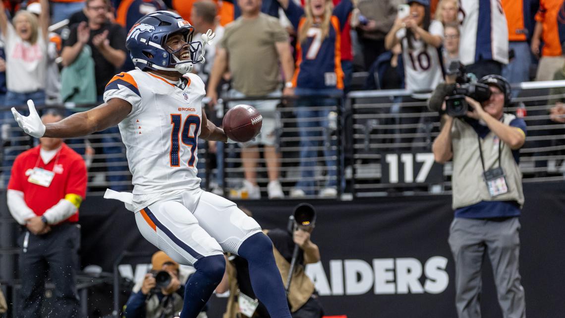 El regreso de despeje de touchdown de 48 yardas de Marvin Mims Jr. hizo que los Broncos lideraran a los Raiders de Las Vegas 14-7 en el entretiempo aquí el domingo ante una multitud en su mayoría vestida con camisetas naranjas en el Allegiant Stadium.