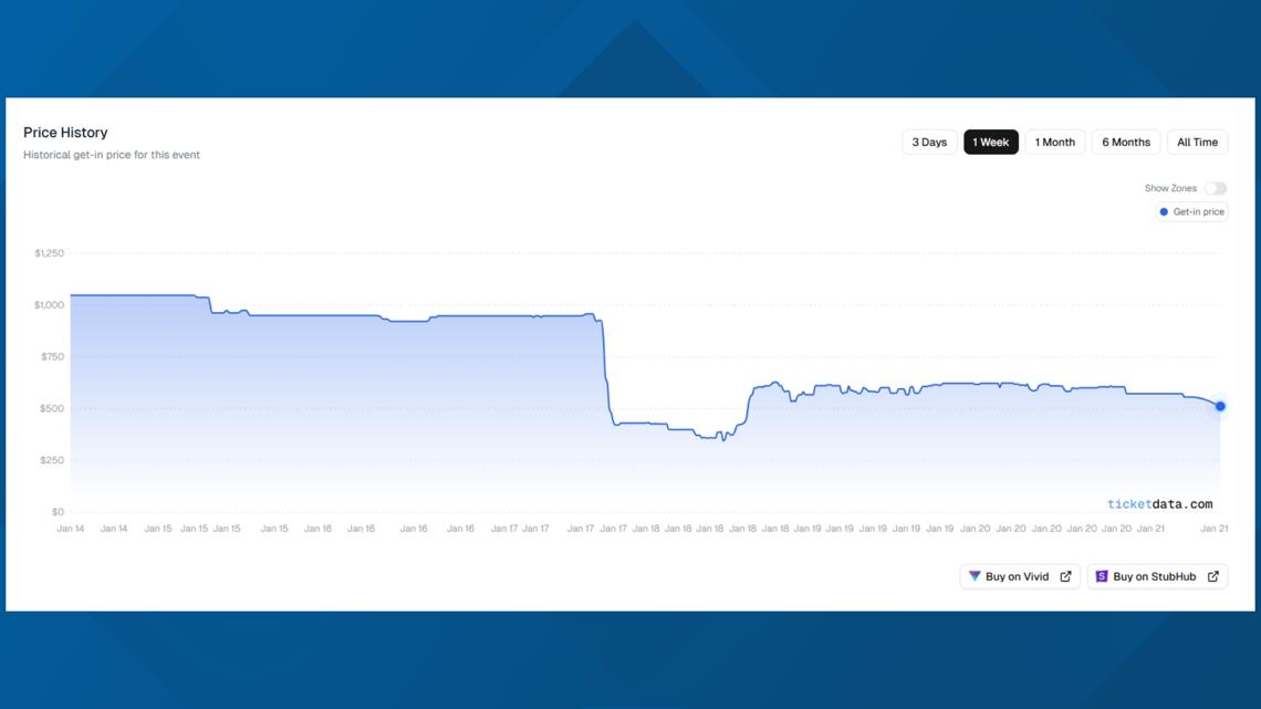 Según Ticketdata.com, el precio del boleto, el precio de los boletos más baratos disponibles, incluidas las tarifas, cayó de $957 justo antes de las 6 p.m. el sábado a $421 a las 9:44 p.m. el mismo día.