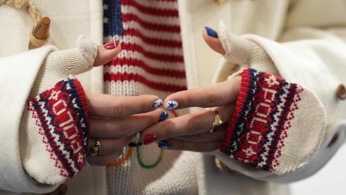 Se probó una chaqueta acolchada roja, blanca y azul que decía “2026” y “USA” y un gorro de punto de estilo nórdico con dos borlas, que movió juguetonamente junto con sus compañeras de equipo de los Moguls Olivia Giaccio, Tess Johnson y Elizabeth Lemly.