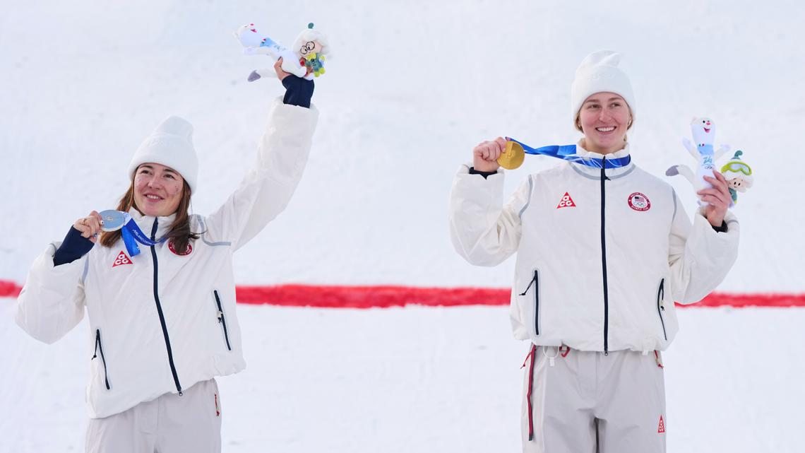 La medalla de la medallista de oro del equipo de EE. UU., Breezy Johnson, se rompió mientras saltaba de emoción después de ganar el esquí alpino.